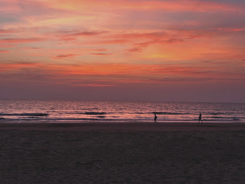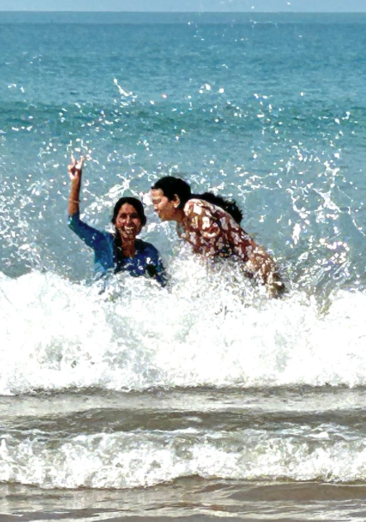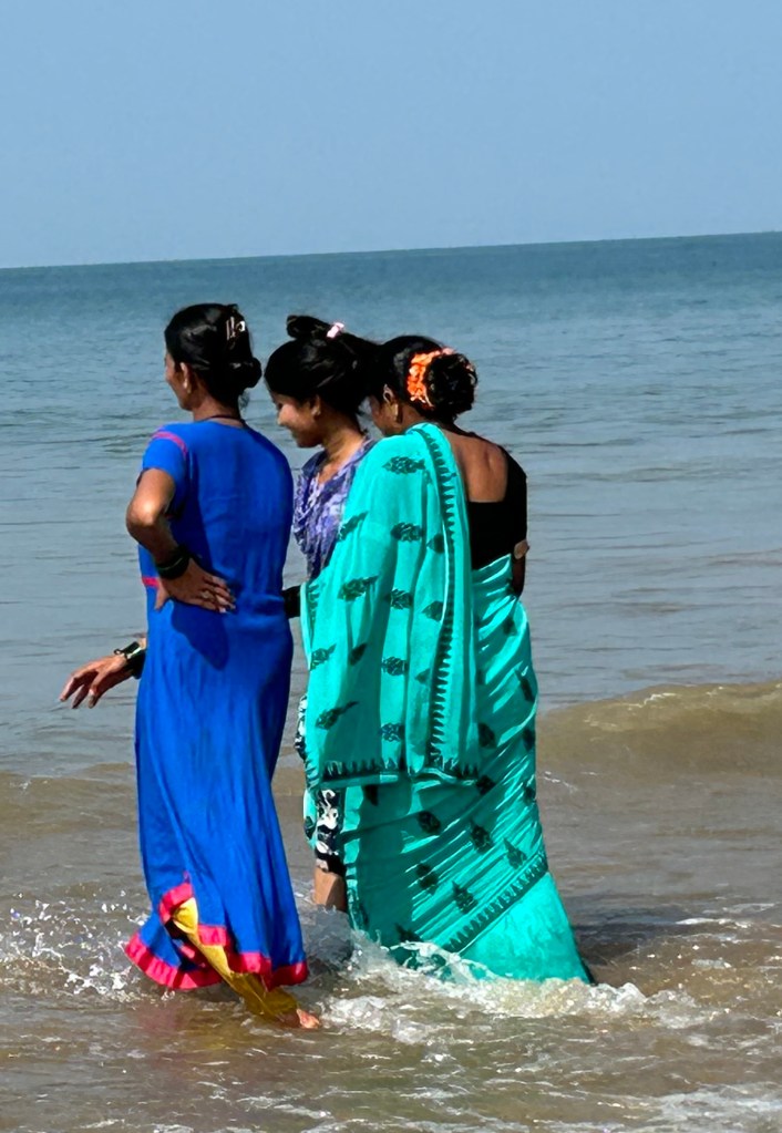 Here at the beach my life revolves around the sea. We swim every morning, in the afternoon I walk along the water’s edge (one swim a day is enough for my dry aging skin), and in the evening we go back to the beach before sunset for dinner at one of the restaurants there. I’m drawn to the sea like a magnet. Today there were high waves that made it too difficult for swimming, but I still had to play in the surf.  I share my love affair with other westerners who return year after year and now more Indian tourists are joining in.