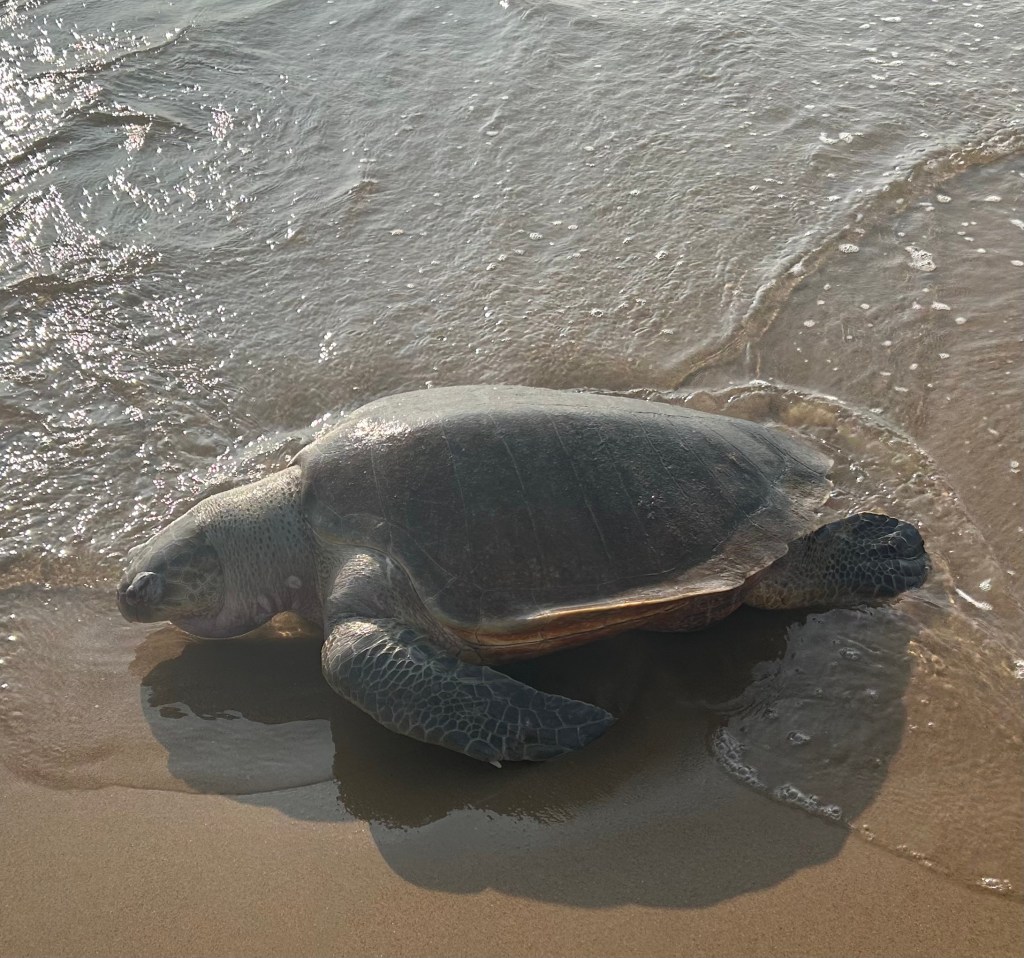 A few days ago, a large water turtle was washed up at the edge of the sea. I knew it was dead because its head was fully extended from its shell.  But the turtle could only have died a short while ago because its scaly head and fins were still pristine. Later that evening I was relieved to see it gone.  I didn’t like to imagine this noble creature being picked at by birds or dogs.