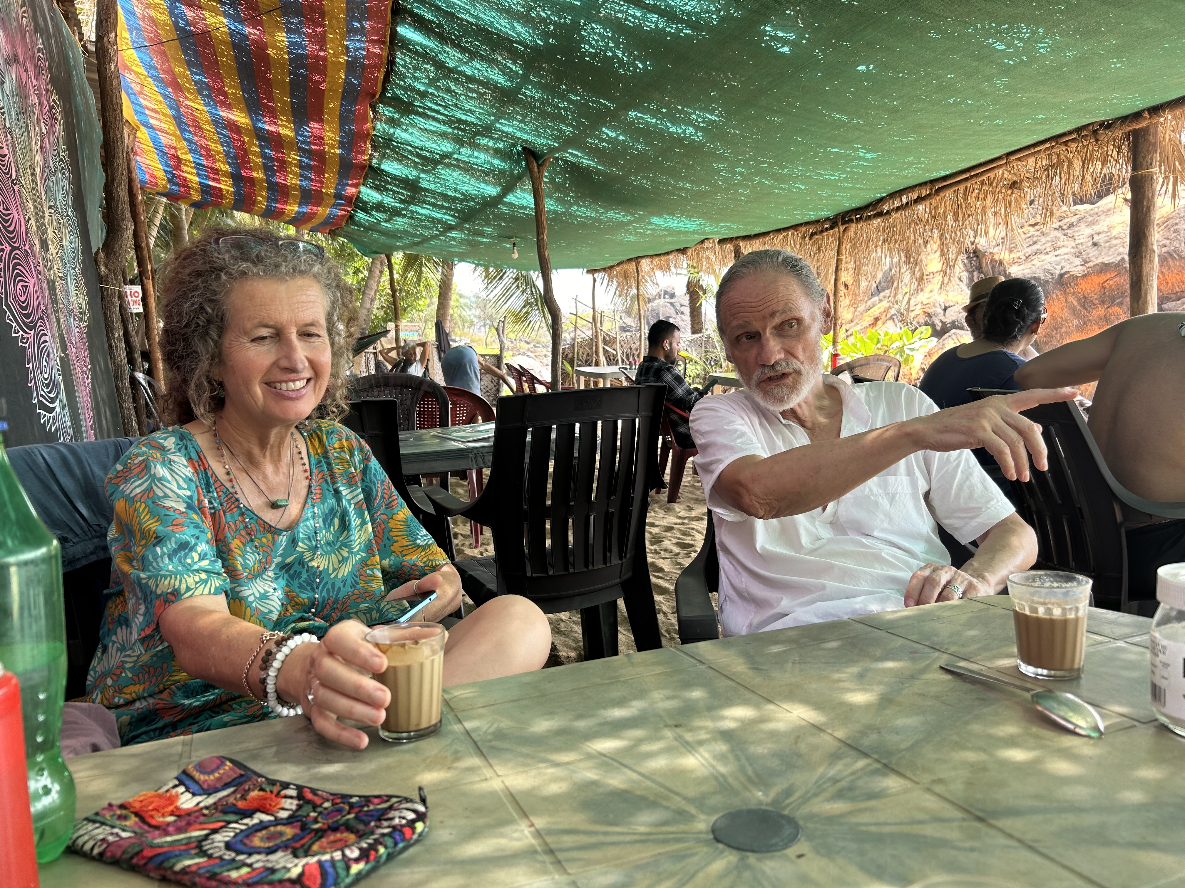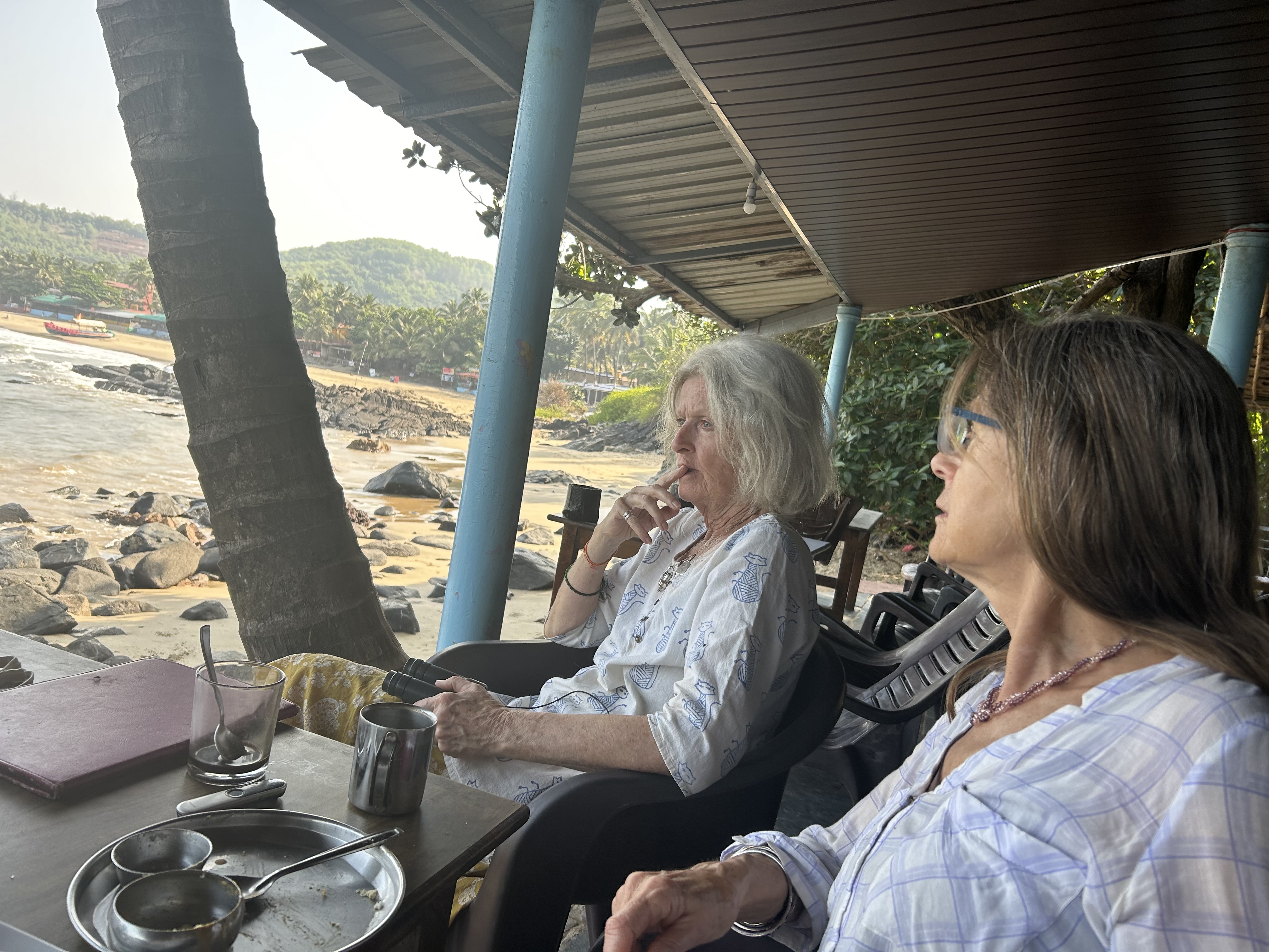 The opportunity to talk with women one-on-one offsets the hearing difficulties of loud India.  Assuntina, a friend of Marina’s, is here for ten days and we walk the beach together in the afternoon. I tell her I’m too dependent on Gerard since my hearing loss.  A social worker, she suggests I begin taking measures now in case he dies before me.  I give serious thought to her advice.  But when I see her again she tells me she had worried she’d gone too far in talking about Gerard dying and upset me.  I welcomed her encouragement for me to contemplate Gerard’s death, or my own for that matter. At the cafe, I approach Iris an elderly lady from Germany, who I’d notice wears hearing aids. When I question her on how she deals with traveling here alone, she assures me, “Of course you could manage too!  I saw you talking with a woman,” and she motions over to Assuntina.  “Yes,” I say, “ but I was doing all the talking; it was a one-way conversation.”  Even at the beach, it’s a noisy world but I’m glad I’m here.
