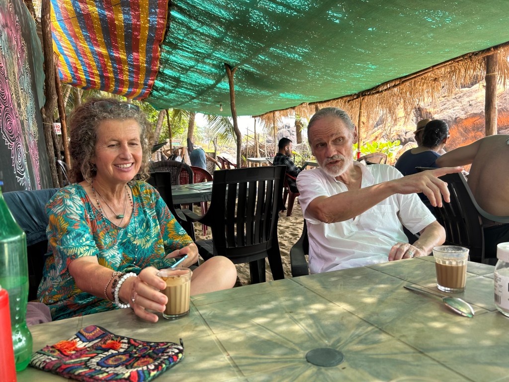 Six weeks at the beach was a luxury for me. Plenty of time for swimming and walking on the sand. And I thoroughly enjoyed the prolonged company of my English friend Marina, and Tina from Ireland. Our friendship could build in a way not possible when you’re just meeting up for a few days and then traveling on your separate ways. Gerard and I were both flattered that our friend Peter came all the way across the breadth of India from Pondicherry to visit us and Swiss Peter visited from Agonda. I enjoyed Gerard’s company swimming almost every day, and when not socializing he happily typed away on his computer, beginning Phase 2 of his memoir. Bitten incessantly by sand fleas and mosquitos bites, he dealt with the itching and sleep disturbance far more stoically than I would have.