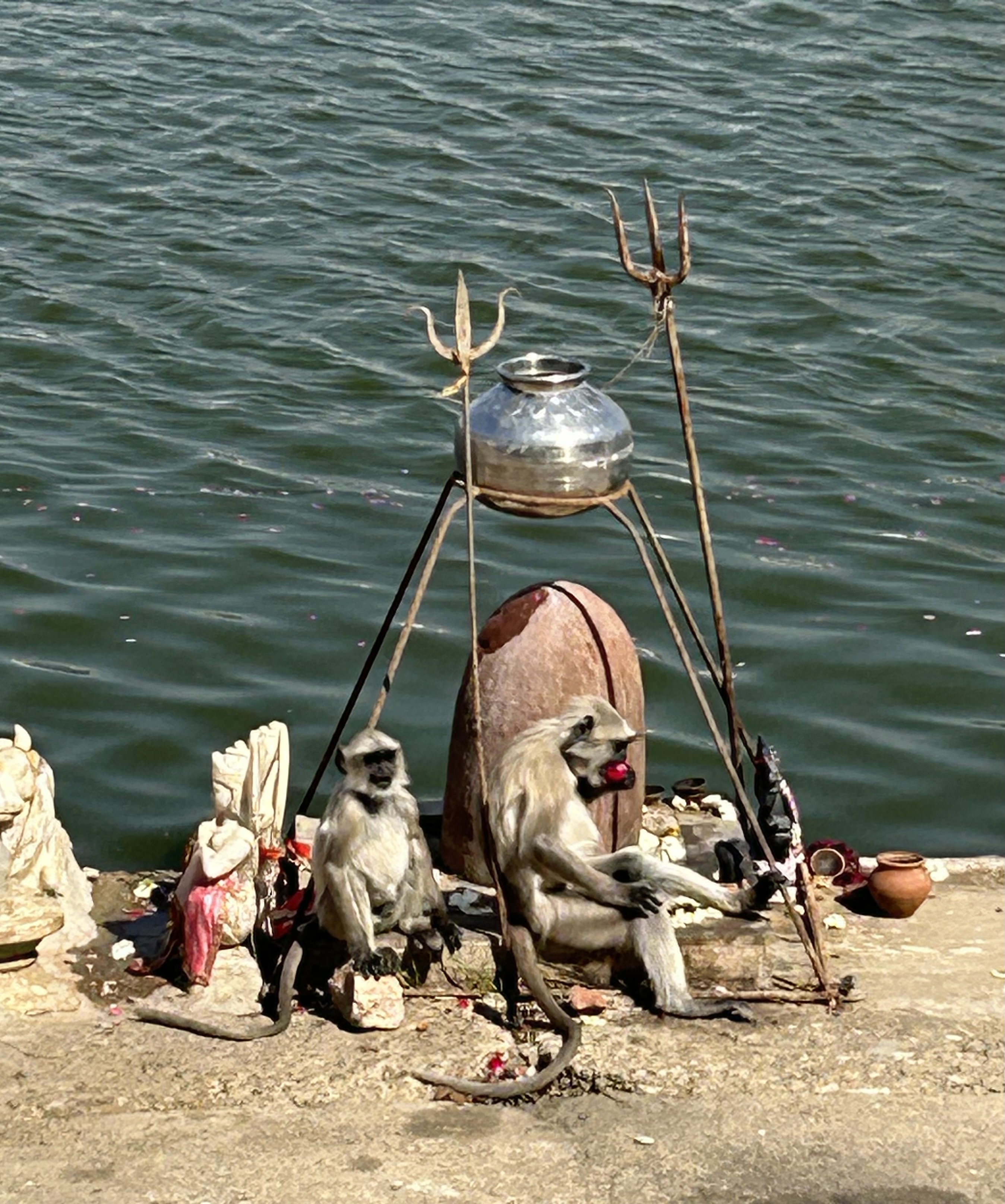 The ghat is shared with the black faced monkeys, often creating mischief.