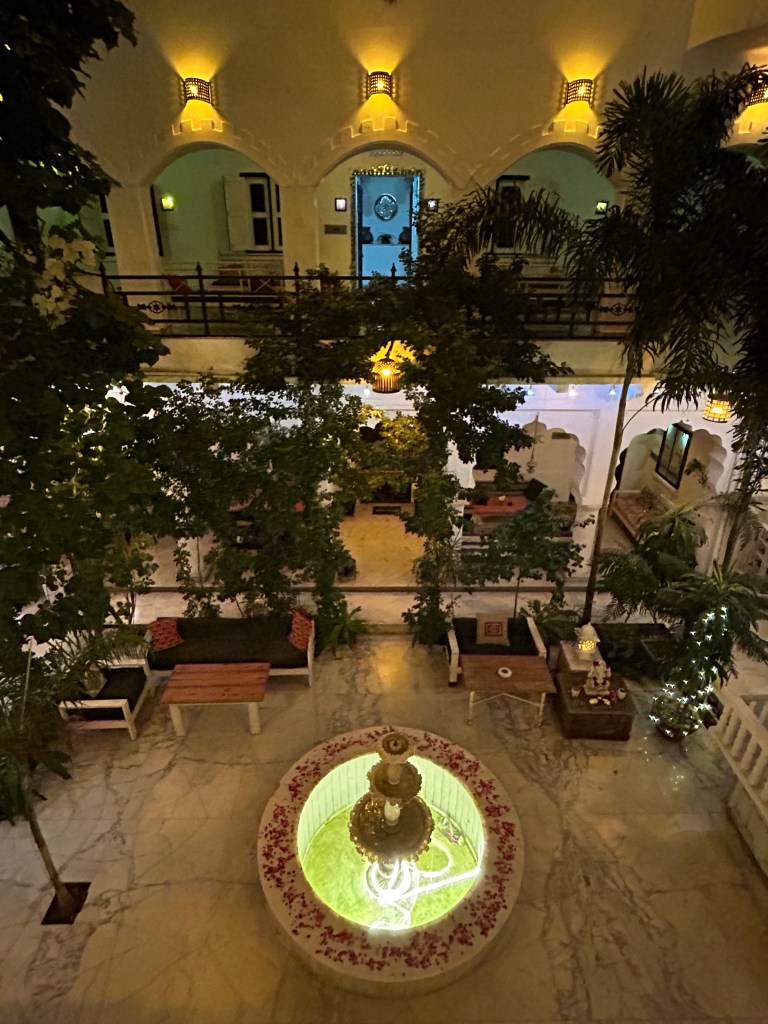 In 2013, Haveli Katkoun was bustling with guests, gathering at night in the dining room on the fourth floor overlooking the palace. Not the case when we arrived this time. We were offered a choice of rooms and picked one in the back to minimize the street noise. (There are still plenty of motorbikes here.) The lack of direct sunlight is compensated by our room’s direct view of the palace, which is lit up at night.