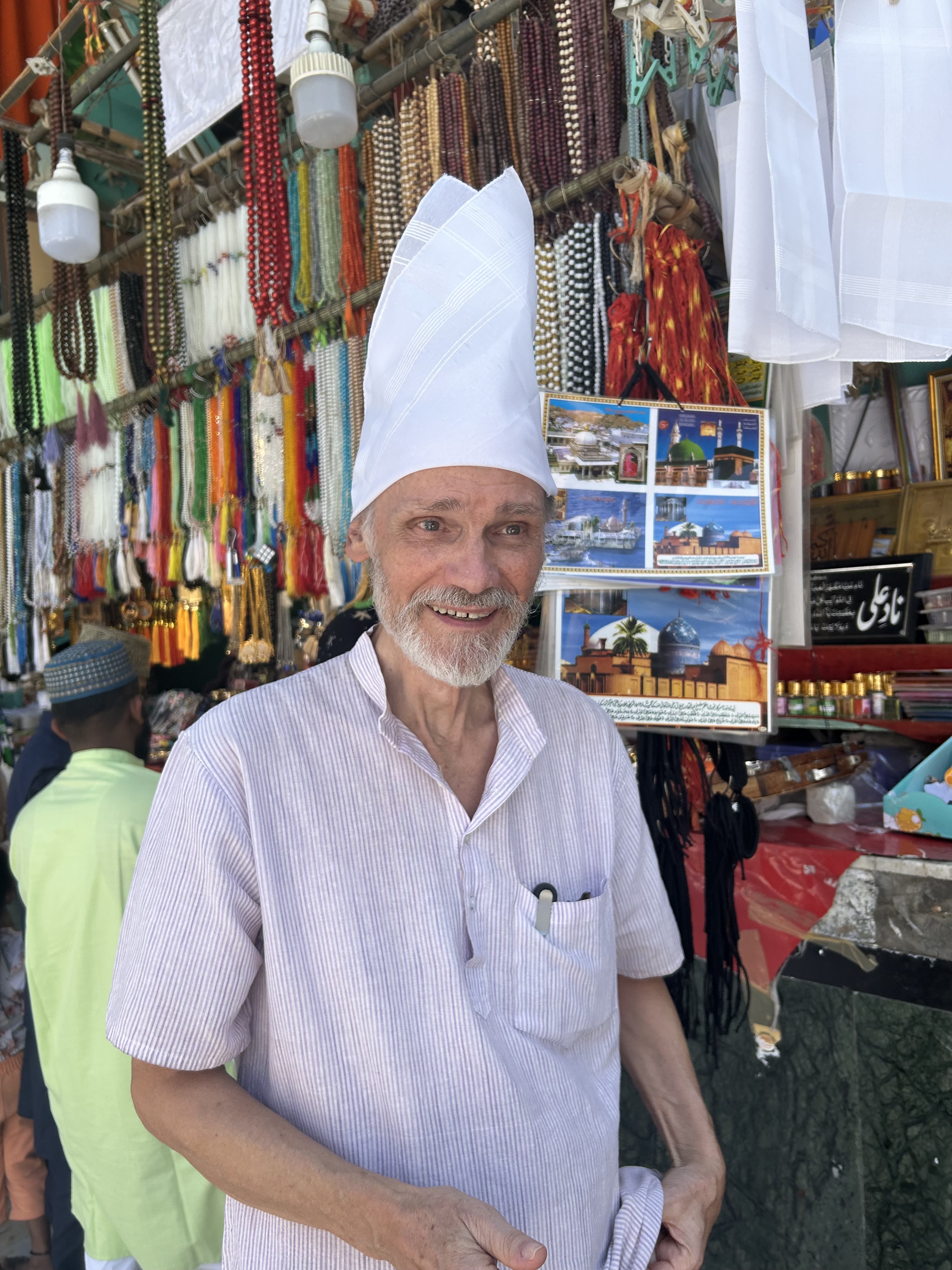 We spent time sitting in the mosque courtyard, taking in the charged atmosphere before entering the tomb to receive any benefit the Saint wanted to give. But first, Gerard needed a head covering and was given a heavily-starched white handkerchief. It perched on his head like a chef’s hat that amused us but he didn’t seem to mind.