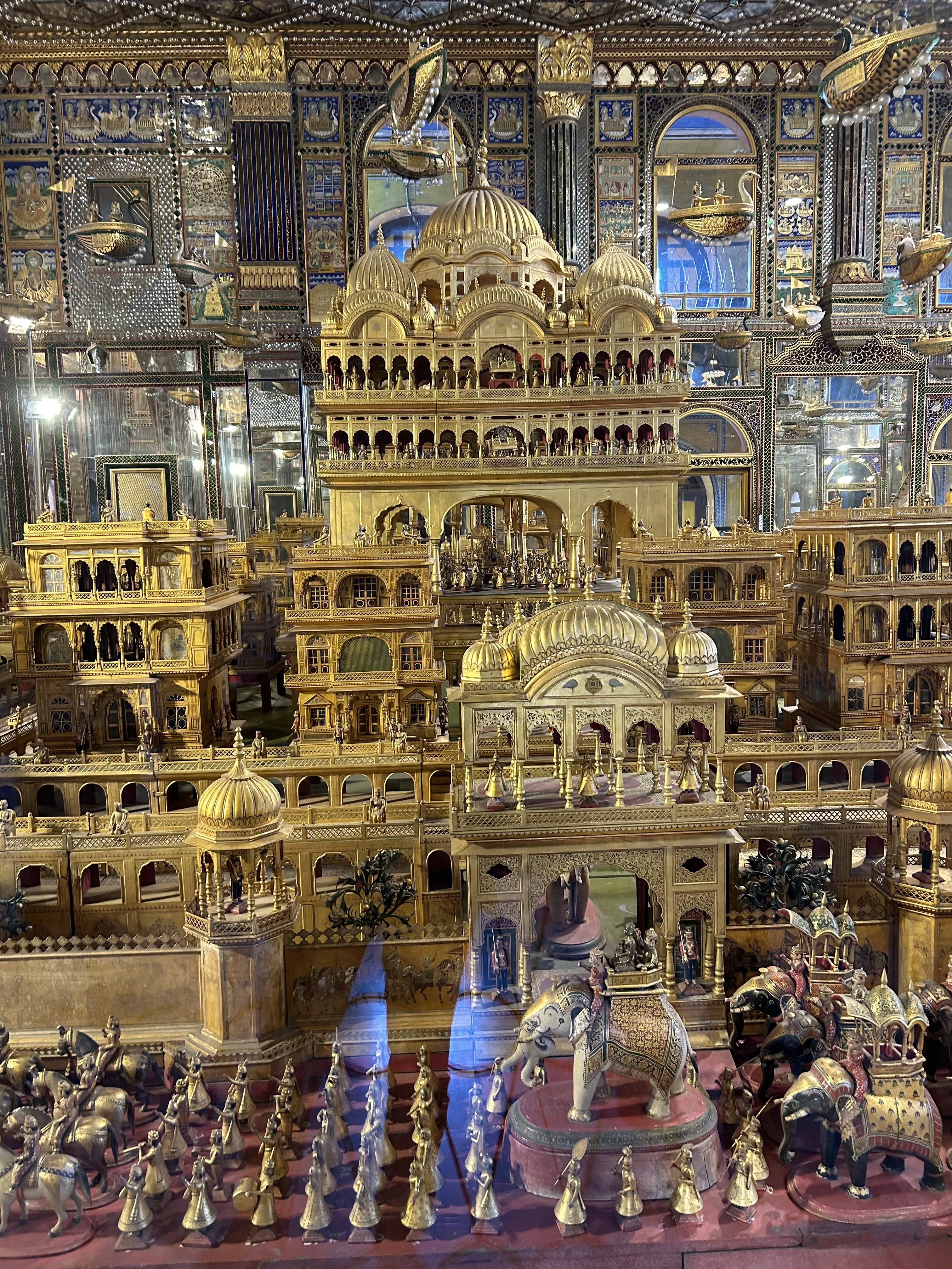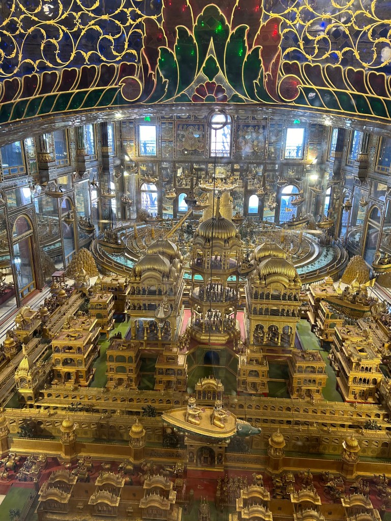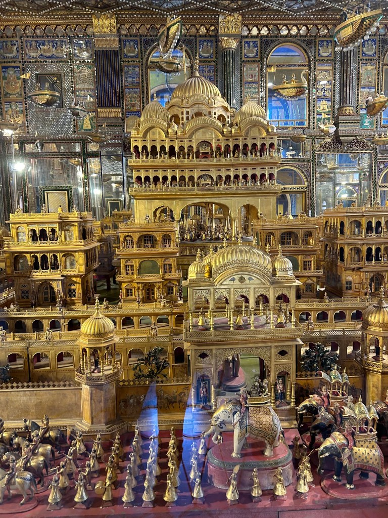 The second place Marina and Rajiv wanted us to visit was a Jain temple that was built and is still owned by the wealthy Soni family of jewelers. Constructed in 1865 with a the two-story museum added 25 years later. In the museum, artisans from Jaipur fashioned a gold-plated three dimensional replica of a the Jain vision of the world. The golden city was like a huge elaborate dollhouse with its intricate carving, miniature figures, and flying spaceships. Five auspicious events in a Jain’s life are represented: conception, birth, renunciation, enlightenment and salvation.