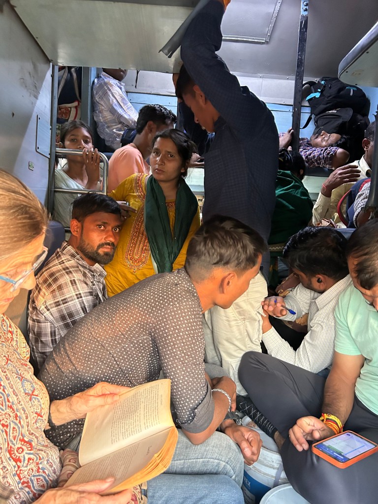 The next day we boarded our eight hour train to Delhi. Booking our tickets only two weeks in advance, sleeper class (just one class up from madhouse general seating) was all that was available. We had not anticipated the rush to get home for the upcoming Holi festival, and the train was packed (as in sardines). Our ‘compartment’ usually accommodates eight passengers but very quickly there were twenty jostling for a place to stand. And where to put baggage? And the 95 degree heat blowing in the open windows? The only reason we were able to sit was thanks to the boys who got on with us in Ajmer making room for the elderly.