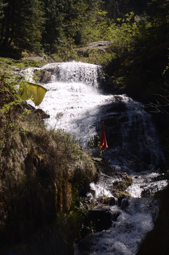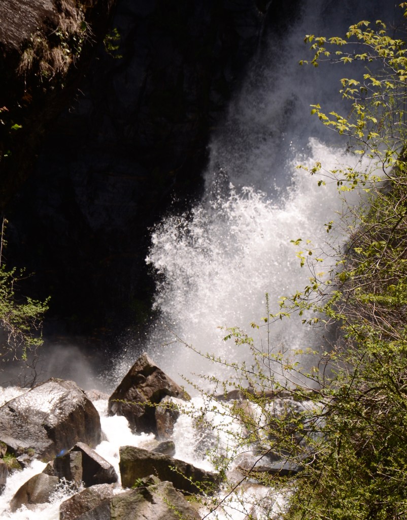 After several days of sunshine, snow is melting and waterfalls gushing down the mountainside. Yesterday, we took the 30 minute walk to the largest and most dramatic. The air was so clear, the mountains looked like cut outs pasted on to the blue sky.