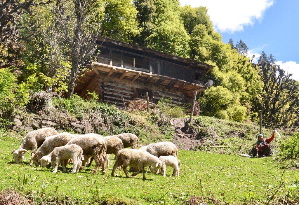 This morning we woke up to a grey sky. Three days of clouds and showers are forecast. We’re not too bothered; we’ve had four perfect days in the mountains. But things have changed. The temperature has dropped 20 degrees (F). Looking down on the houses below our room the color has gone. The wood and stone is grey and cold. The women are still washing clothes at the spring, laughing and chatting as they work – but they’re not laying the colorful fabric out to dry on their roofs. How will they dry their clothes? At the foot of the stairs, heat radiates from the room with the cows. I understand now why the old houses are built with room for livestock to live beneath.