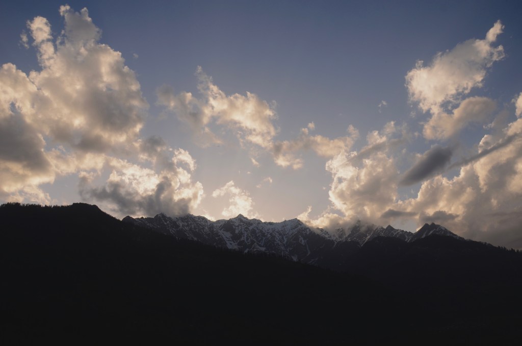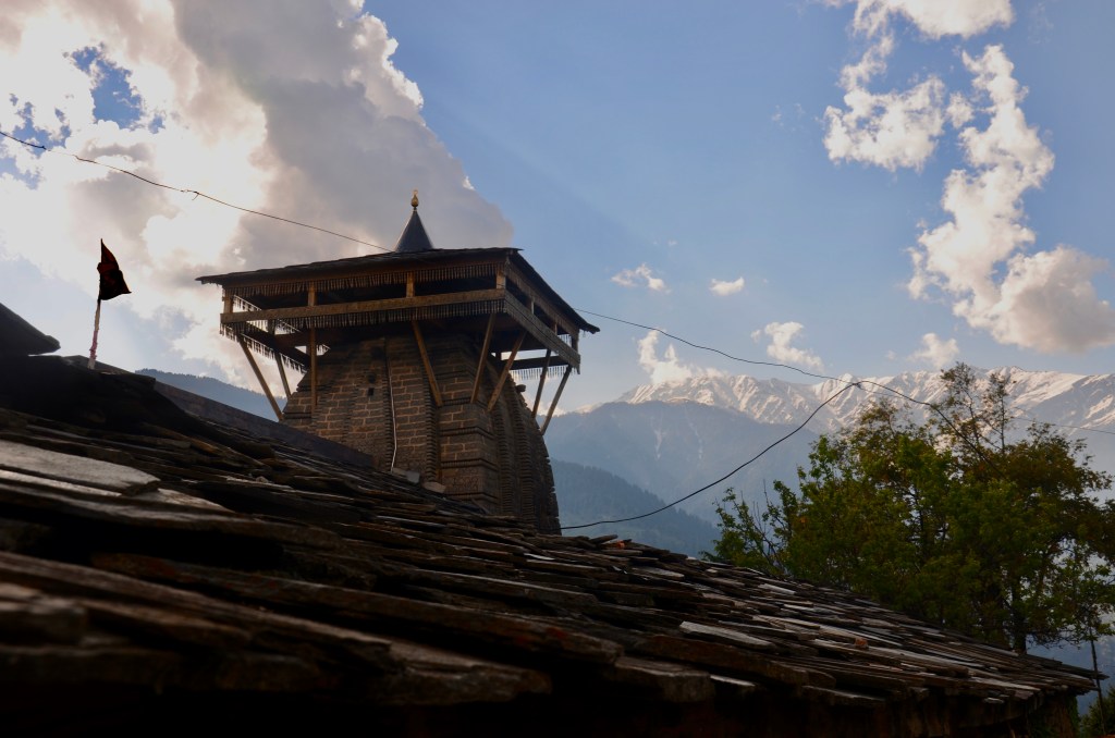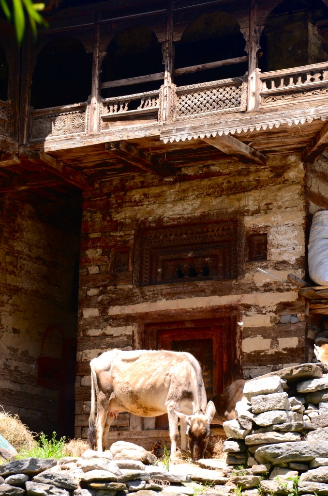 Vashisht has evolved from a rustic village with hot springs across the Beas river from Manali, to what now seems like a second Rishikesh. Always a hangout of pot heads and would be mountain climbers, today there’s a throng of young people in denim or cotton floral shorts and hiking boots, dreadlocks and tattoos….and still a few aged travelers like ourselves. There’s also more Indian tourists than ever, although most come for the day and retire to Manali at night. The season’s already underway and our hotel from two years ago was full. So were the surrounding hotels, or a too high climb up the mountainside for our liking. After almost two hours traipsing around the narrow lanes, climbing up and down, Gerard finally found us a good replacement, right in the old village. While I had sat comfortably in the sun guarding our baggage. Tough job but somebody has to do it! Four floors up via an external circular staircase, the room has a great view of the mountains, afternoon sun, solar heated water that so far hasn’t let us down, and breakfast on the roof. Some of these new buildings still maintain the custom of livestock on the ground floor, our hotel is no exception. I like to stroke the cow’s forehead on our way out.