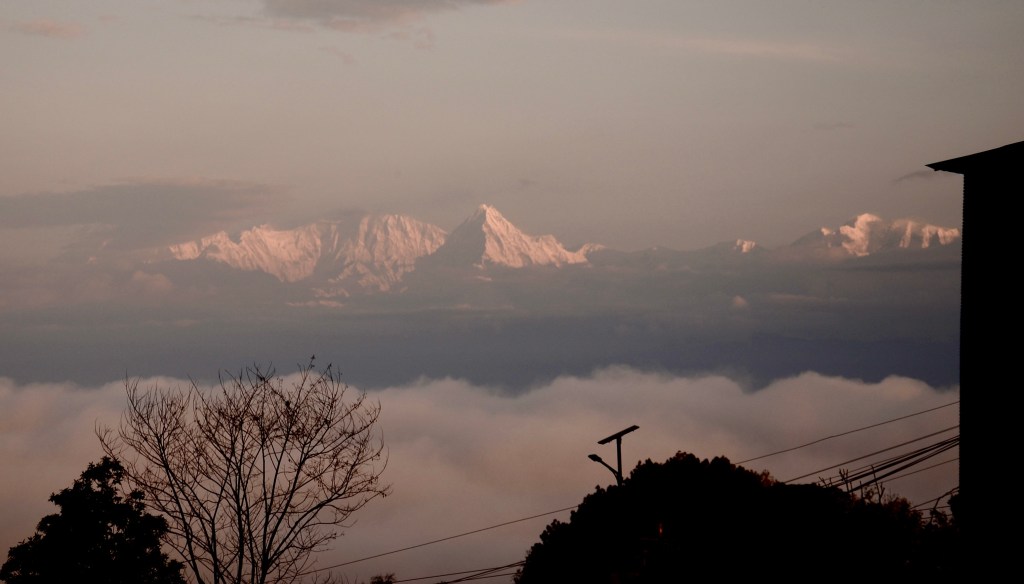 We have been in Nepal for three weeks and hadn’t seen the snow-capped mountains until this morning. After a night’s rain, in the early morning our rooftop gave us a grand view.