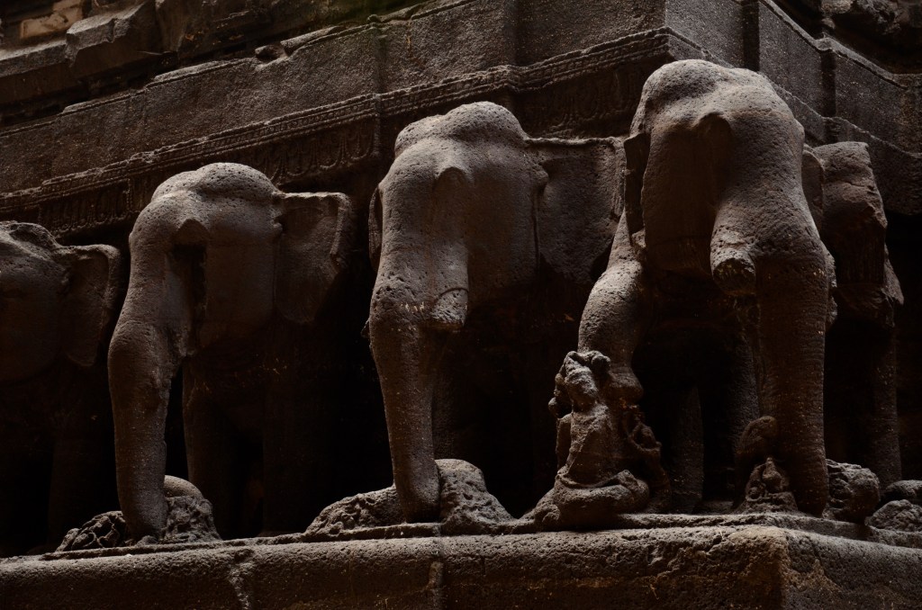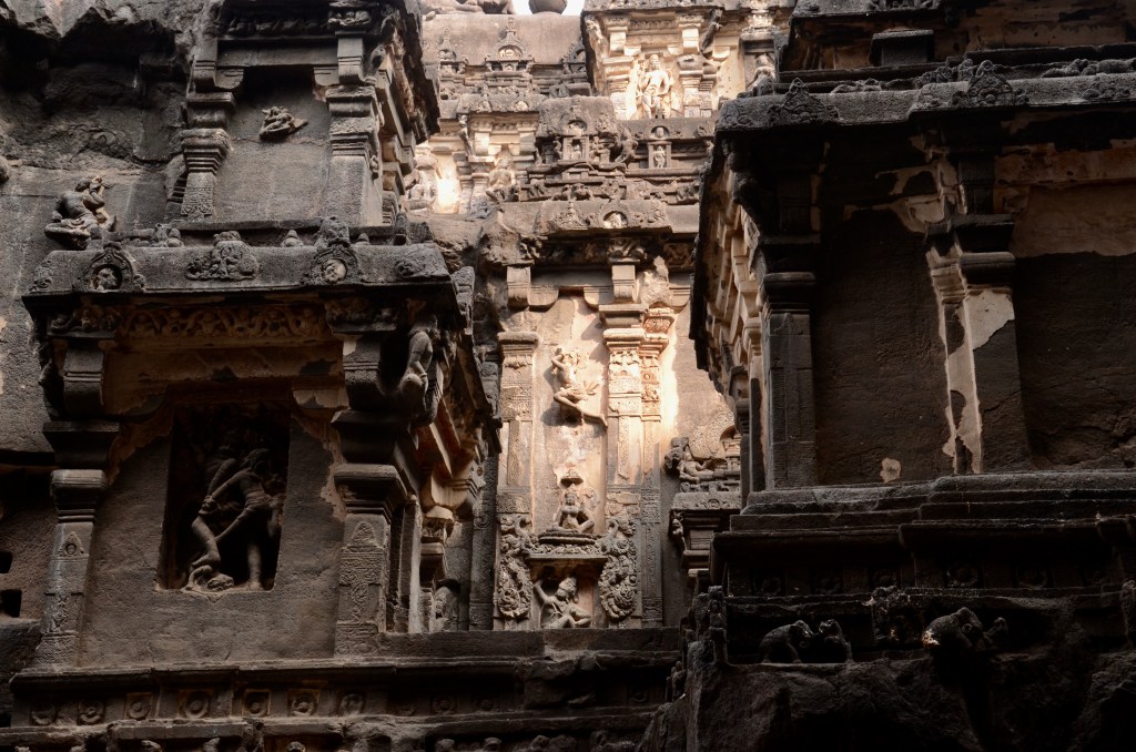 Most impressive is a massive complex: Kailasha is a Hindu temple dedicated to Shiva. It’s said to have taken ten generations to complete and includes a large pillared hall, antechambers, and gigantic sculptures of Hindu deities. Wall panels depict Hindu mythologies: in particular, the two major epics, Ramayana and Mahabharata. Though the stone sculptures and decorations have worn away over the centuries, they are still impressive.