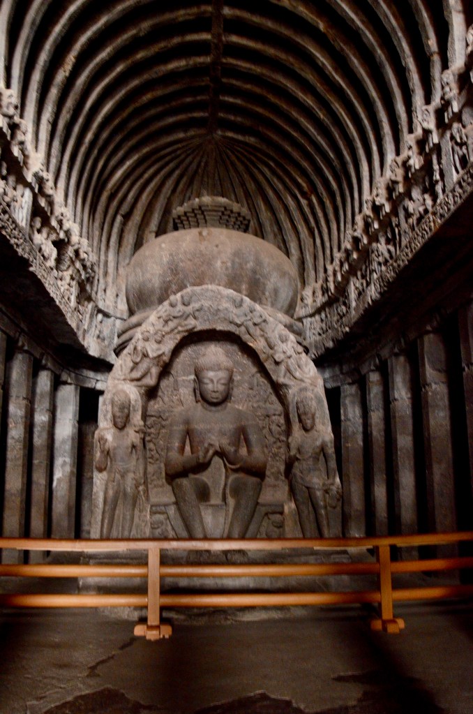 Most of the Buddhist caves are multi-story monasteries with massive carved Buddhas. The largest is the three-story ‘Vishvakarma or ‘Carpenter’s Cave’ so-called because the rock has been given a finish that looks like wooden beams.